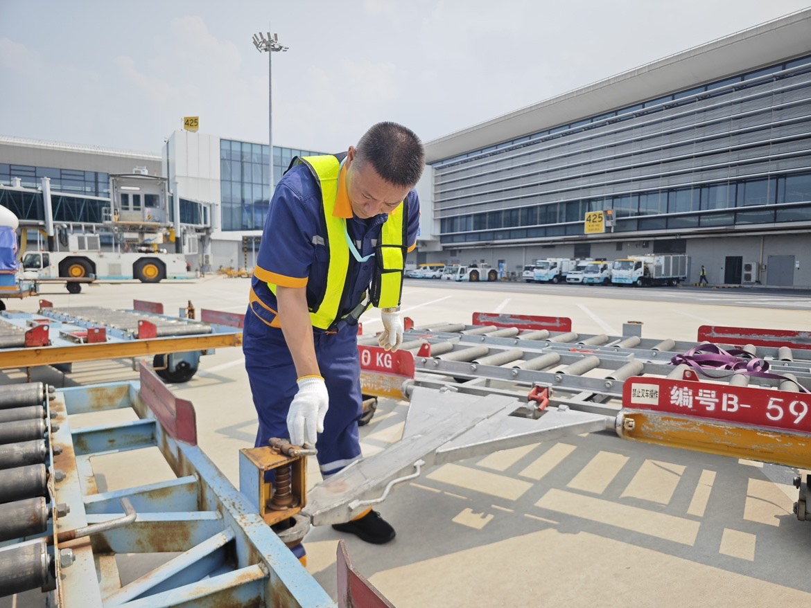 烈日下,国内货站外场牵引车司机高立明正俯身检查挂板拖的牢固程度。他一边擦拭着额头的汗水,一边说道:“高温天气不仅要做好自身防暑,车辆、设备的安全检查更要严格。在机坪作业,容不得半点马虎。”说着,他又仔细确认了一遍连接处的安全锁扣。