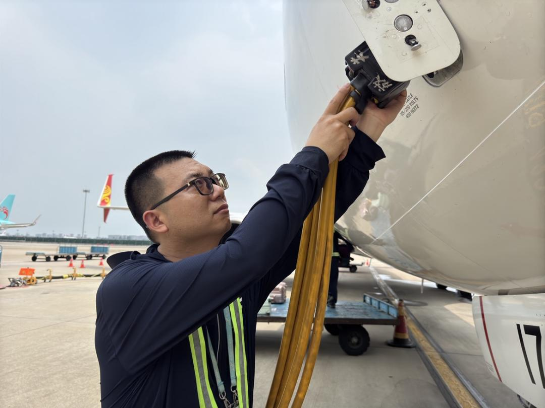 桥载操作员杨海江正专注地进行地面电源接驳作业,烈日下,近距离可以看到豆大的汗珠不断从他的脸颊滑落。“公司后勤保障很到位,”他擦了擦汗,边说边从防晒服口袋掏出藿香正气水和人丹,“不仅配发了防晒服和防暑药品,下午还会送来绿豆汤、盐汽水。这些实实在在的关怀让我们工作更有动力了!”