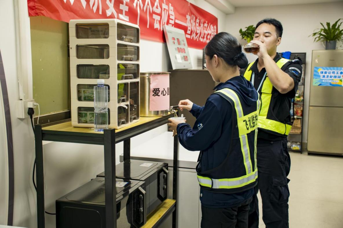 为切实做好防暑降温工作,保安公司延伸防暑关怀措施,通过班组会、交班会等形式强化员工防暑安全教育,在休息区设置健康提示栏,供应酸梅汤等解暑饮品;根据高温预警动态调整员工轮岗时间,避免员工高温时段长时间露天作业;同时充分发挥工会“心声墙”等作用,持续收集员工意见,营造安全舒心的工作环境,护航员工以最佳状态保障机场安全运行和旅客平安出行。