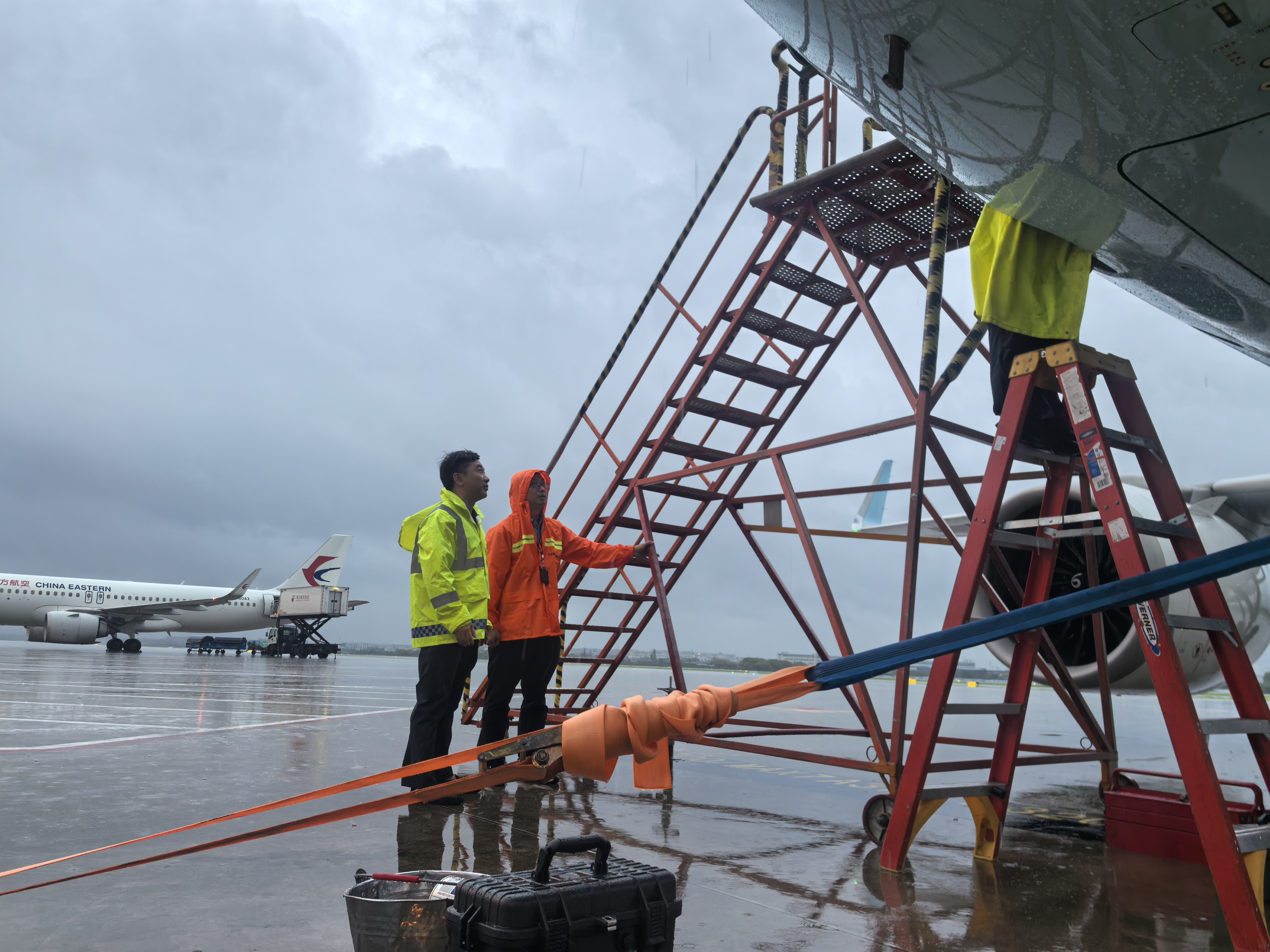 宁波机场对机坪全部工作梯、牵引杆等设备系留装置进行了全面排查和紧固,梳理库存系留铁链确保数量充足。对飞行区排水系统、下滑台等重点设施设备进行检查,确保适用。