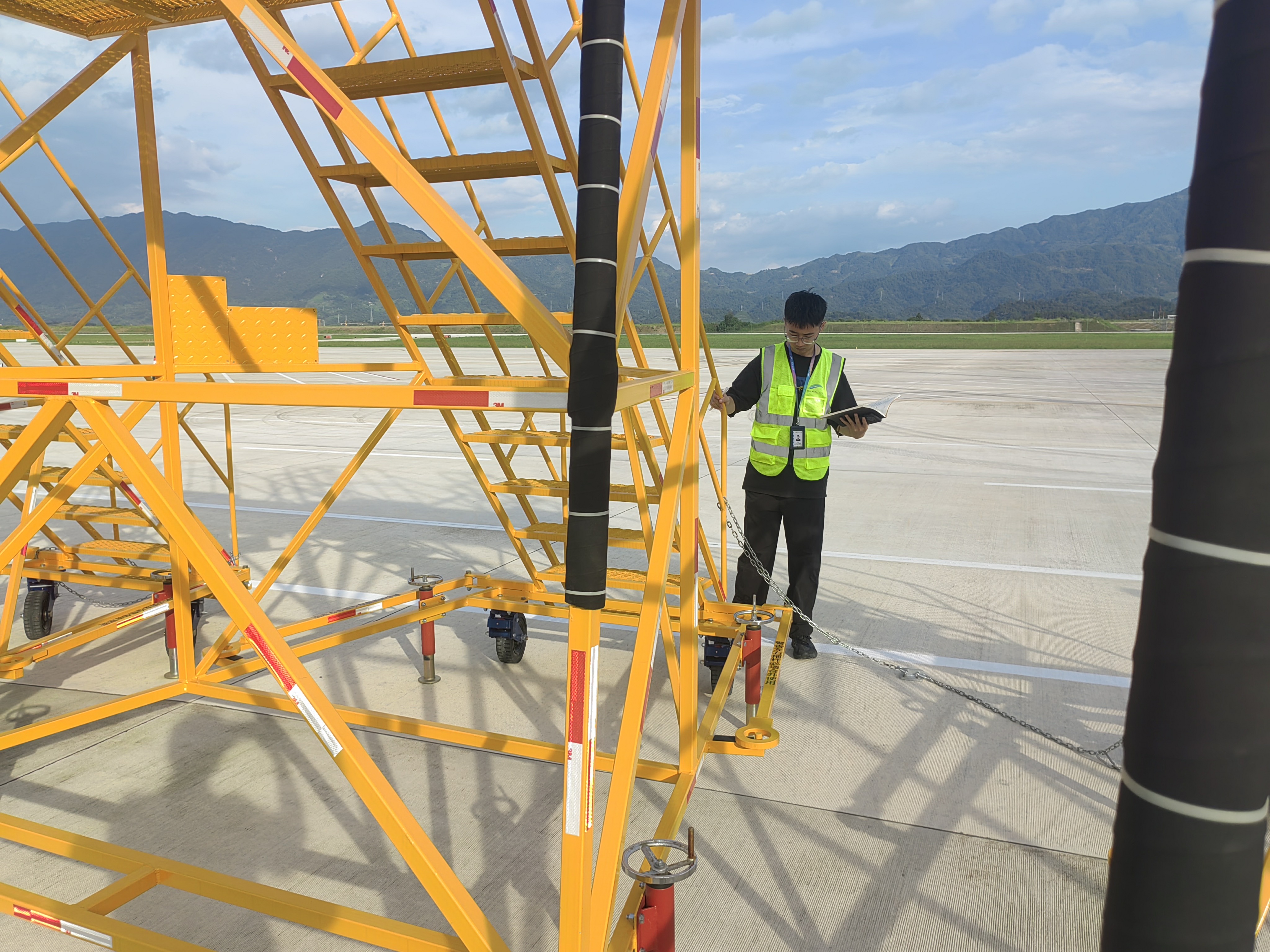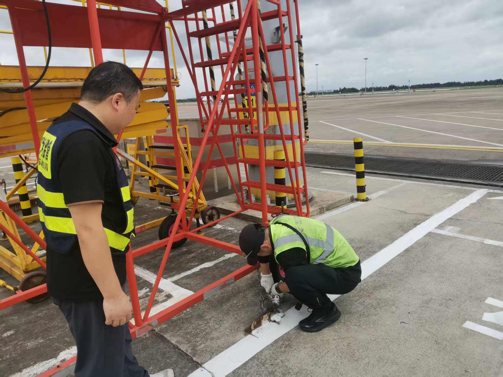 为做好台风防御工作,丽水机场运行管理部监管员前往机坪进行防台工作的检查,重点检查了工作梯等无动力设备的固定系留情况,并实地查看了场务部沙袋储备及应急准备进展。同时,针对机场低洼地带、易涝点和排水沟等重点区域进行了全面排查,确保防汛措施落实到位,全面保障机场运行安全。