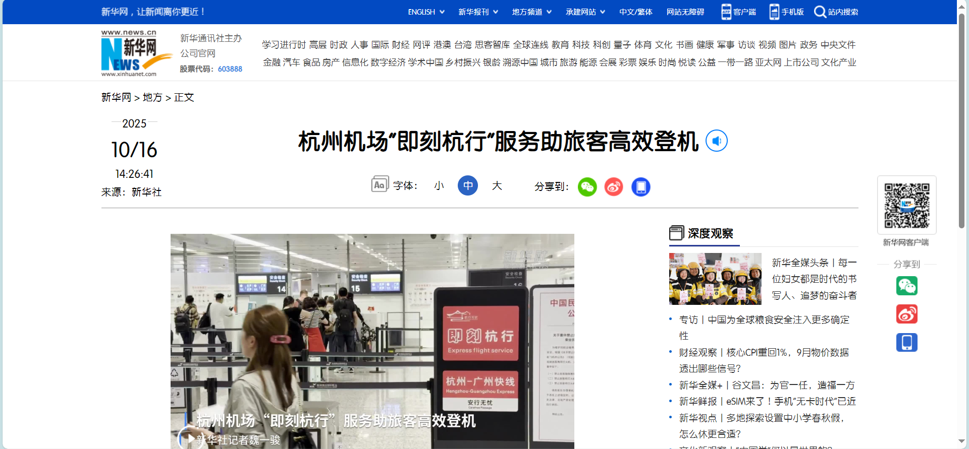 10月16日,新华网报道《杭州机场“即刻杭行”服务助旅客高效登机》。