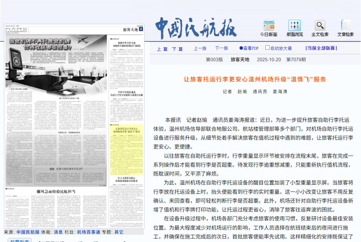 10月20日,中国民航报发布《让旅客托运行李更安心温州机场升级“温情飞”服务》