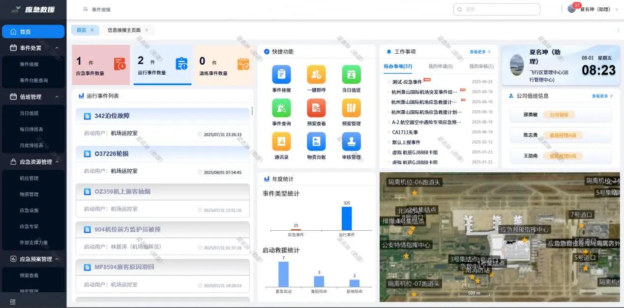 8月1日,杭州机场应急救援管理系统上线启用。新系统融合应急态势监控、运行与应急事件处置、指挥联动、资源管理等应急处置功能,大幅提升应急响应效率与跨部门协作能力,标志着杭州机场应急管理向数字化、智能化转型迈出关键性一步。